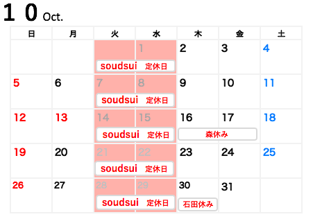 2025年09月29日 カテゴリー:お知らせ お休みの知らせ☆ 10月のお休みの知らせになります。 通常どおり火曜水曜が定休日。 スタッフのお休み 森・・・・・10/16(木)、17(金) 石田・・・・10/30(木)